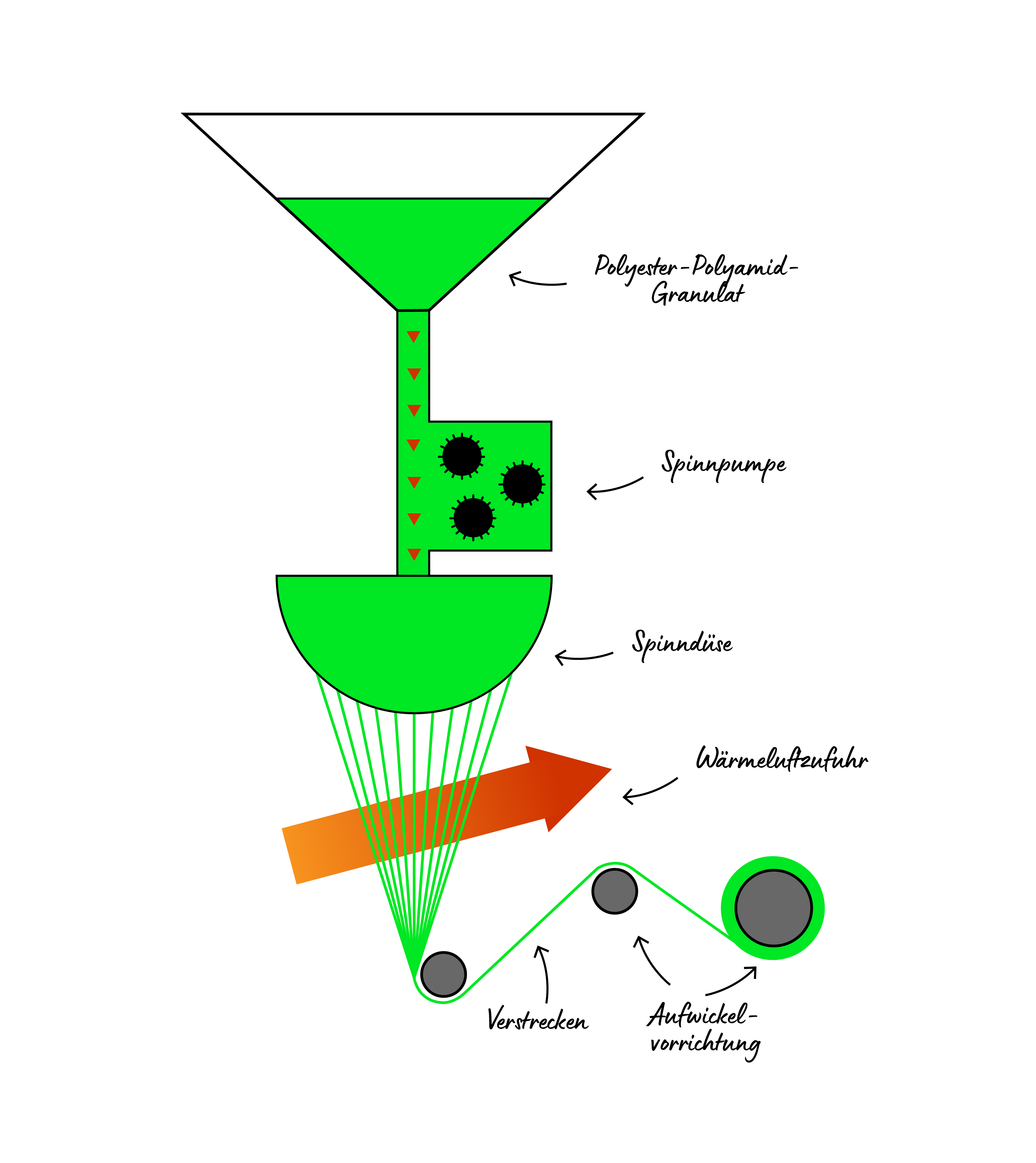 Ein Gemisch aus Polyester- und Polyamid-Granulat wird erhitzt, bis es flüssig wird. Diese flüssige Masse wird dann durch eine Spinnpumpe zur Spinndüse geleitet.